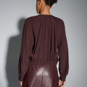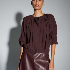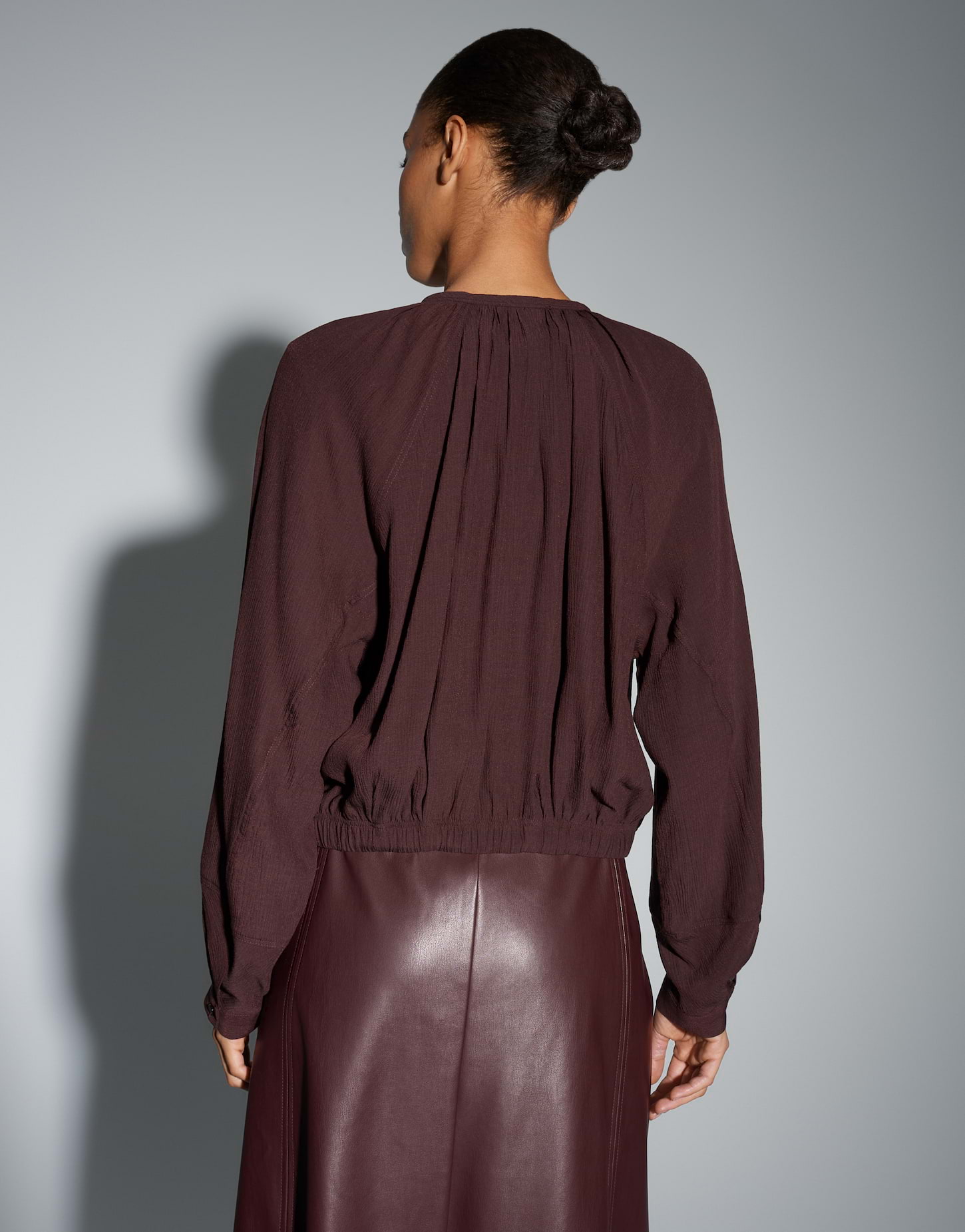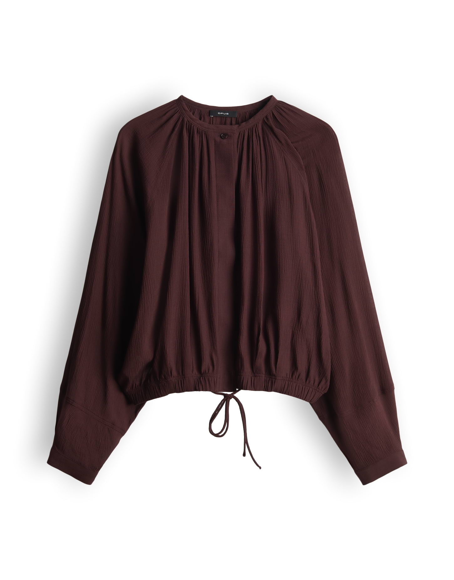weite Passform, O-Form, Langarm, Rundhalsausschnitt, Rückenlänge ca. 54 cm bei Größe 36, Model Größe 177 cm – trägt Größe 36, Webware, Crinkle Effekt, natürlicher Griff, leichte Transparenz, Kräuselung am Halsloch, Gummibund am Saum, verdeckte Knopfleiste, Ballonärmel, elastischer Gummi am Ärmelsaum