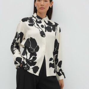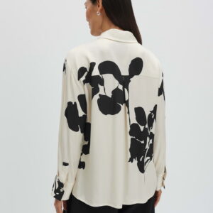 weite Passform, hinten länger als vorne, überschnittene Schulter mit Langarm, Hemdblusenkragen, Rückenlänge ca. 70 cm bei Größe 36, Model Größe 175 cm – trägt Größe 36, Satin, dezente Twillstruktur, glatter Griff, fließender Fall, dezenter Schimmer, floraler Print, Kellerfalte im Rücken, abgerundeter Saum, Knopfleiste, Schlitze in den Seiten