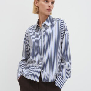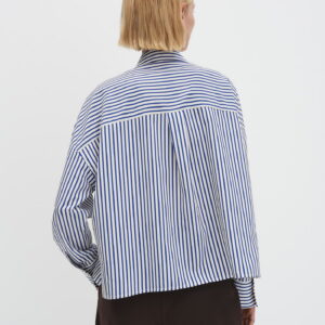 weite Passform, Boxy Silhouette, leicht verkürzt geschnitten, überschnittene Schulter mit Langarm, Hemdblusenkragen, Rückenlänge ca. 60 cm bei Größe 36, Model Größe 177 cm – trägt Größe 36, Webware, glatter Griff, weich fließender Fall, pflegeleicht, Falte im Rücken, verdeckte Knopfleiste, Schlitze in den Seiten