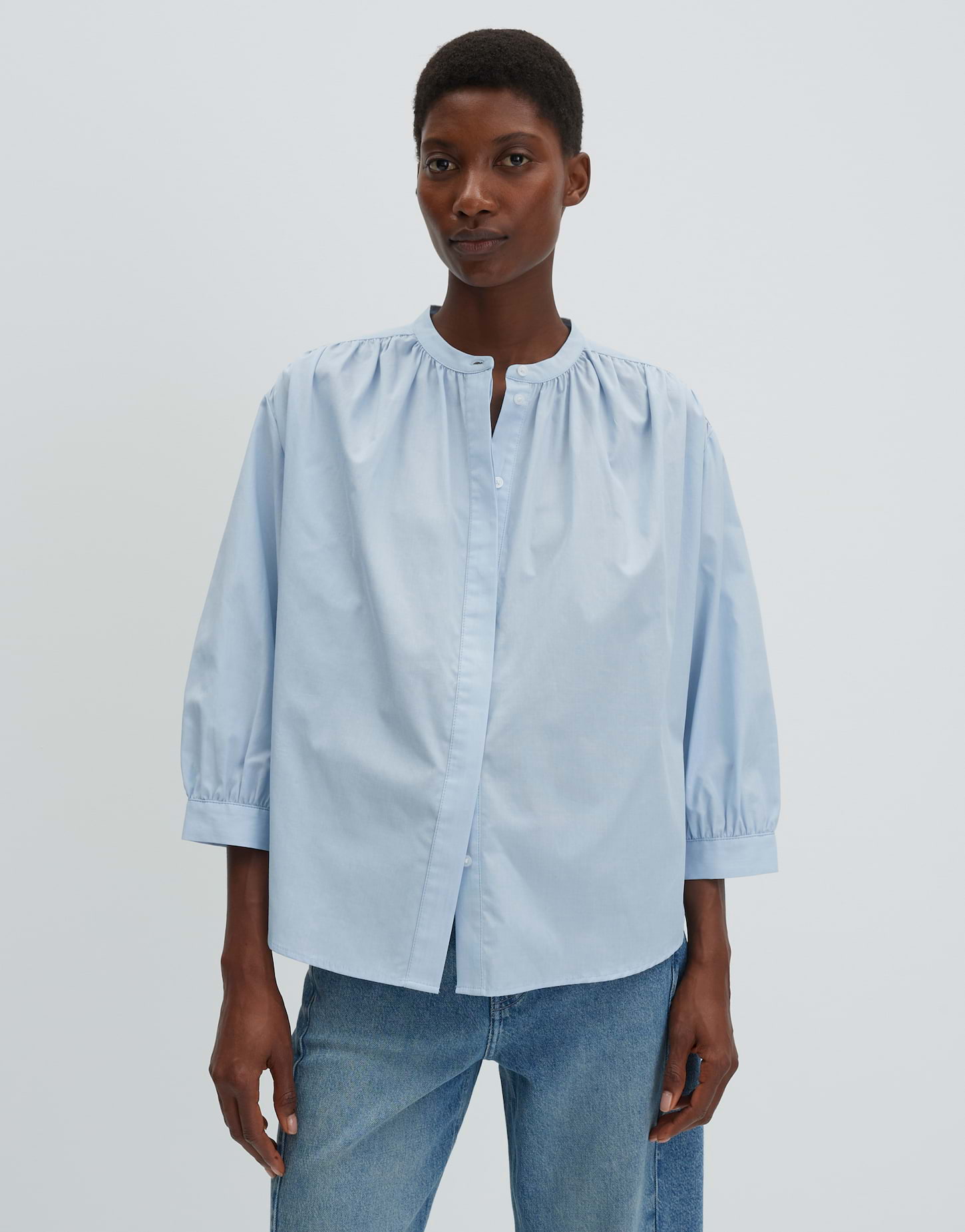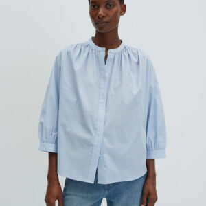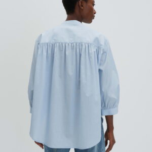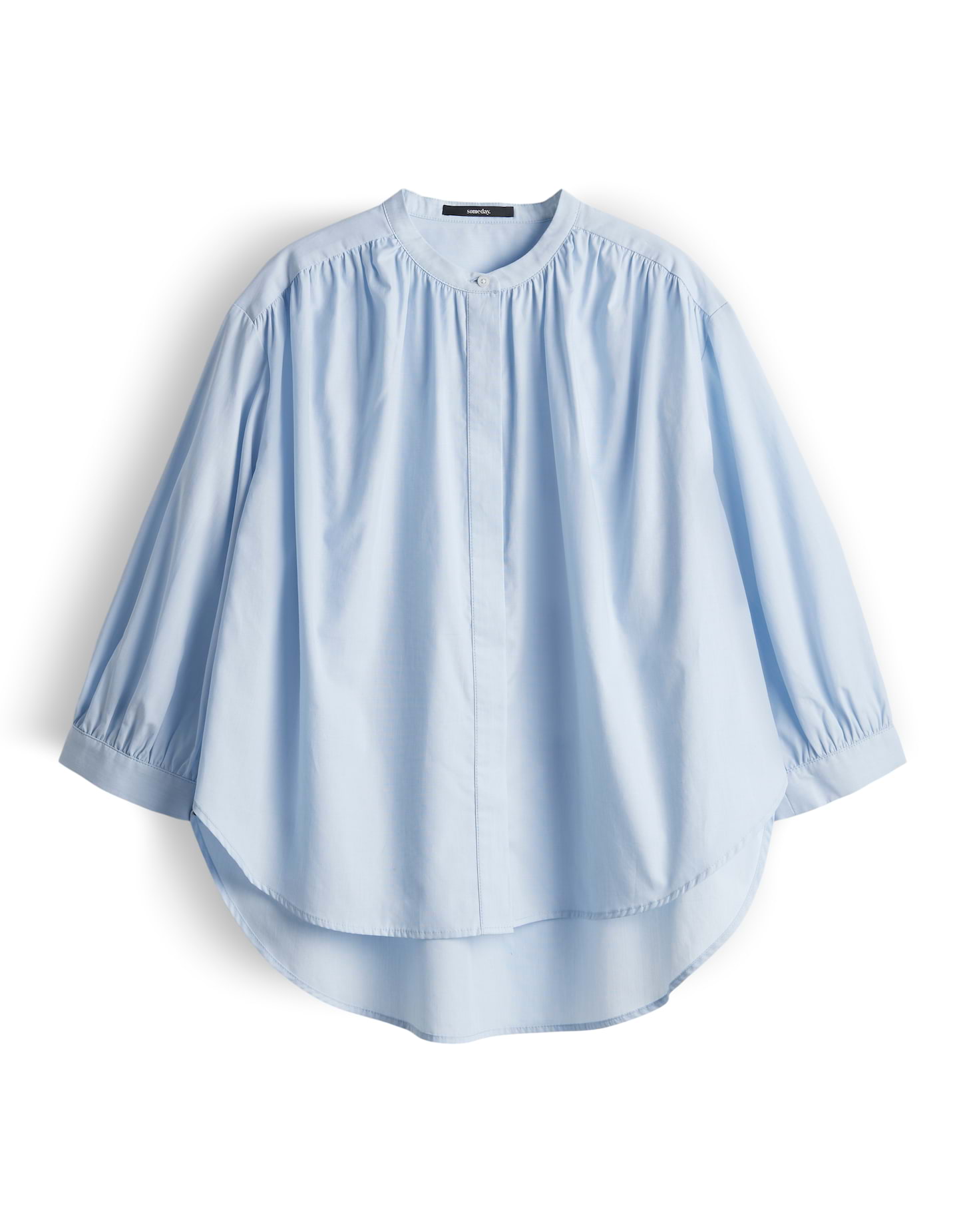 weite Passform, oversized, hinten länger als vorne, 3/4 Arm, Rundhalsausschnitt, Rückenlänge ca. 74 cm bei Größe 36, Model Größe 176 cm – trägt Größe 36, Webware, glatter Griff, fließender Fall, pflegeleicht, Chambray Optik, Kräuselung am Ausschnitt, Raffung unterhalb der hinteren Passe, abgerundeter Saum, verdeckte Knopfleiste, Ballonärmel