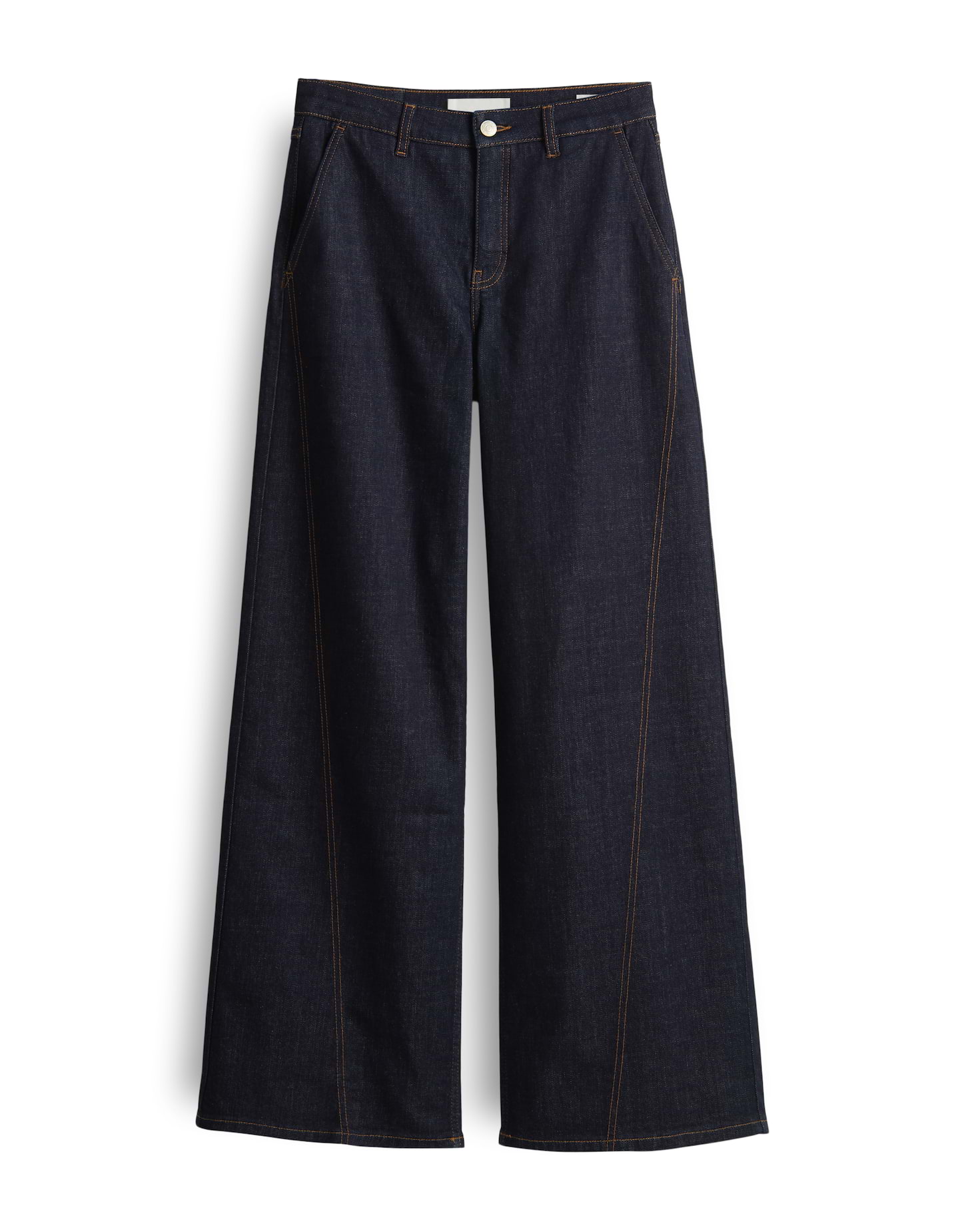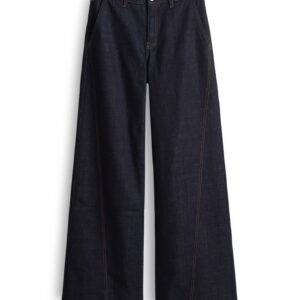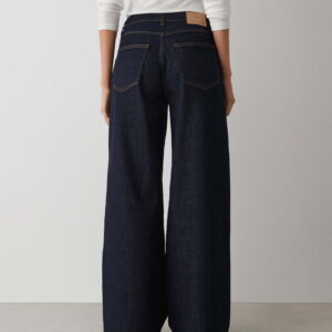 sehr weiter Beinverlauf, Mid Rise, Long, Hosenbein Innenlänge in jeder Größe: L32 ca. 81 cm, Model Größe 177 cm – trägt Größe 36, Denim, enthält nichttextile Teile tierischen Ursprungs, fester Griff, Rinsed Waschung, elastischer Stoff, 5-Pocket-Design, aufgesetzte Taschen hinten, verdeckter Zip-Fly, vorverlegte Seitennähte, Leder Patch