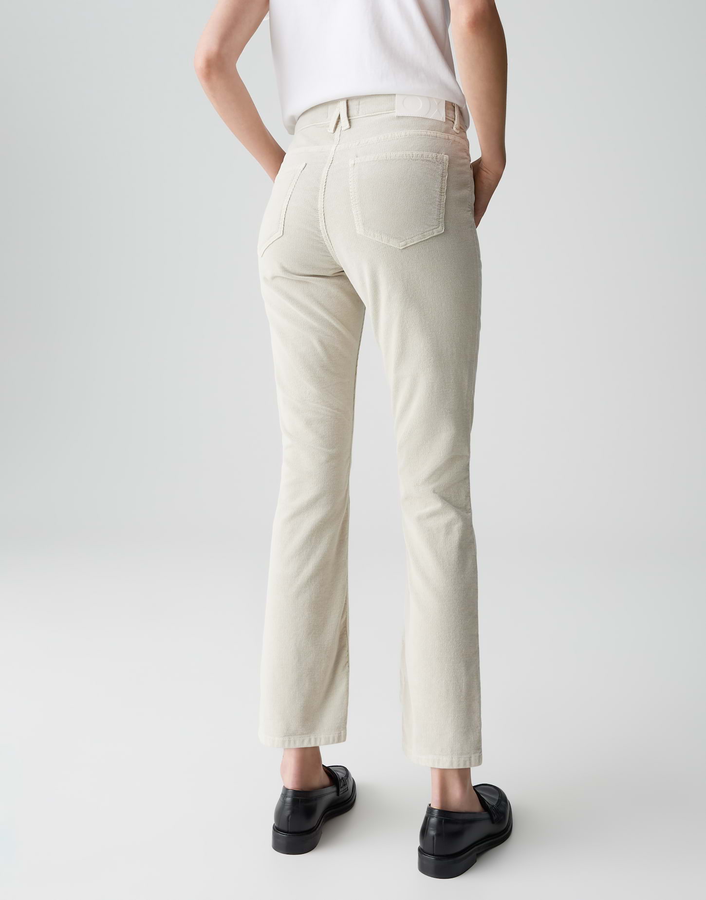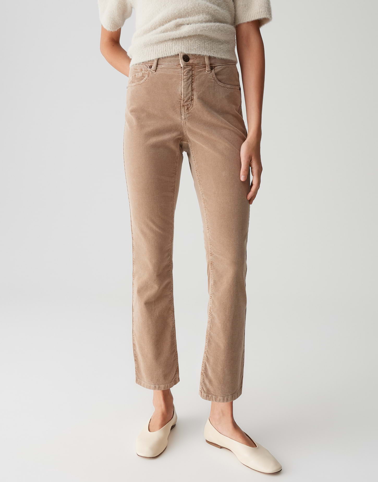 schmal am Oberschenkel, leicht ausgestelltes Bein, Hosenbein Innenlänge in jeder Größe: L28 ca. 71 cm, Model Größe 177 cm – trägt Größe 36, Cord, feine Rippstruktur, weicher Griff, samtige Oberfläche, elastischer Stoff, 5-Pocket-Design, aufgesetzte Taschen hinten, verdeckter Zip-Fly