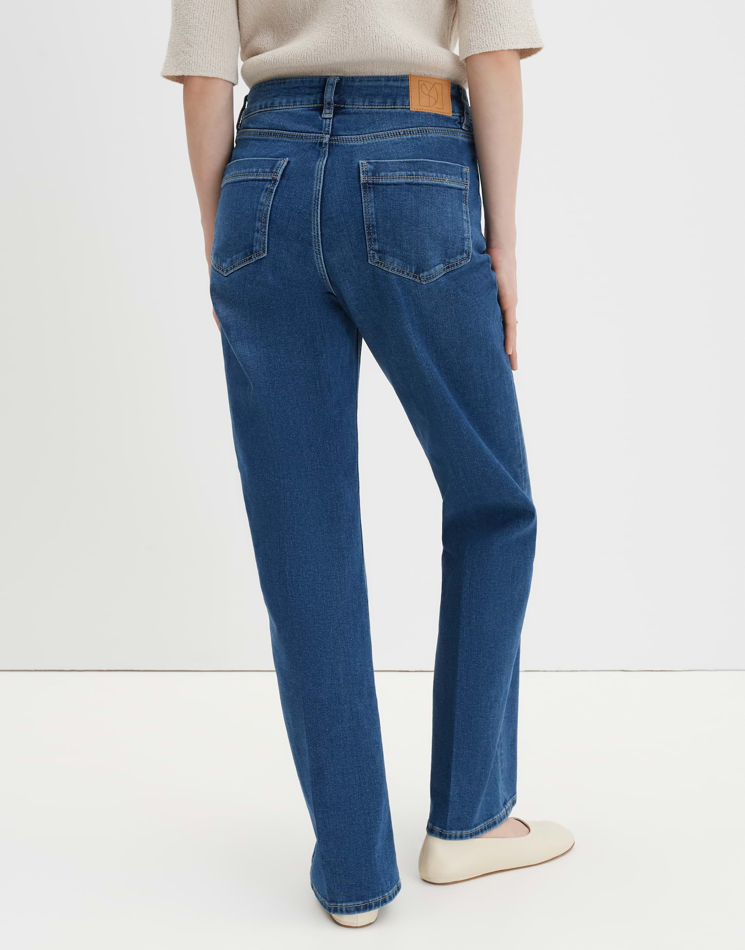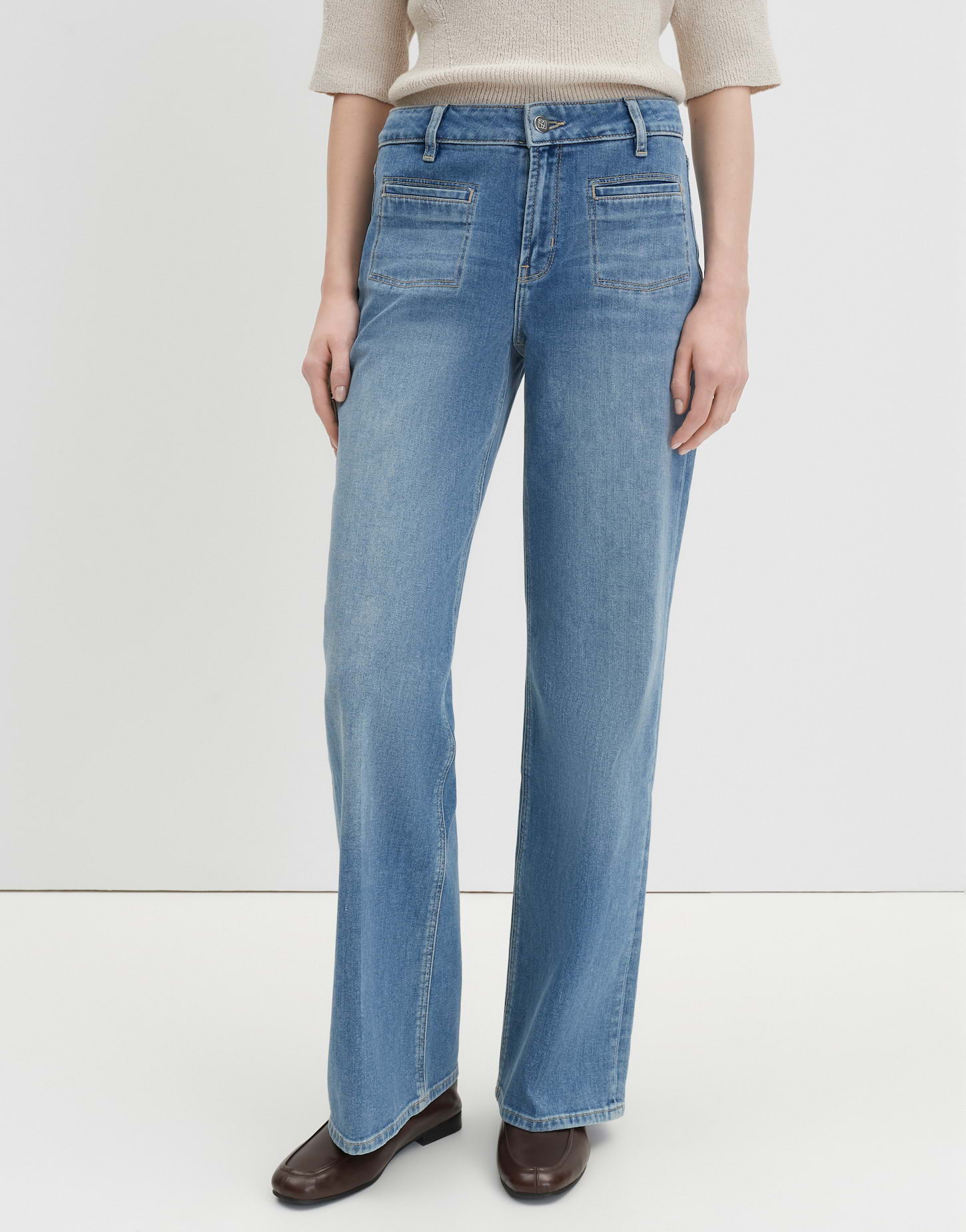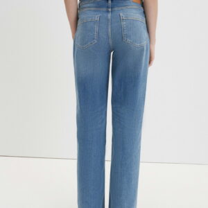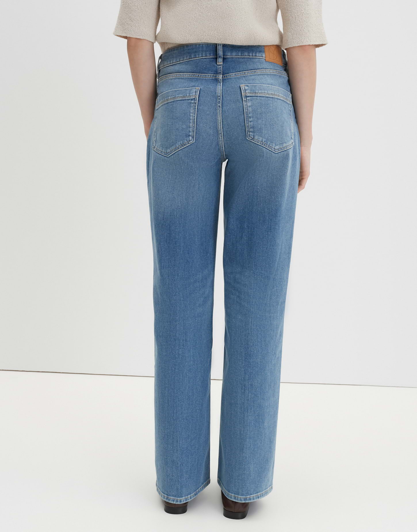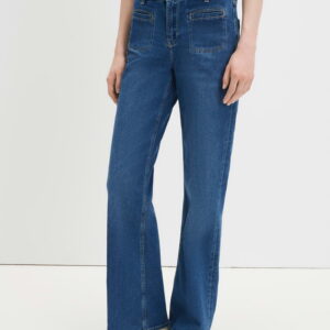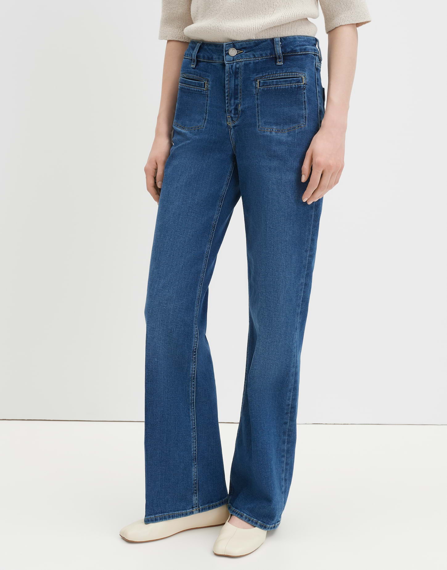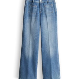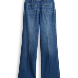 lockere Passform, leicht ausgestelltes Bein, Hosenbein Innenlänge ca. 81 cm in jeder Größe, Model Größe 176 cm – trägt Größe 36, Denim, elastischer Stoff, natürlicher Griff, Paspeltaschen vorne, eckig abgesteppte Taschen, Bügelfalten, verdeckter Zip-Fly