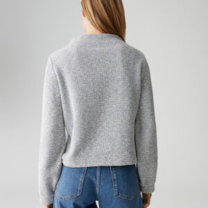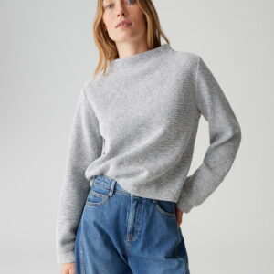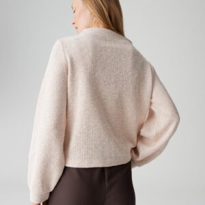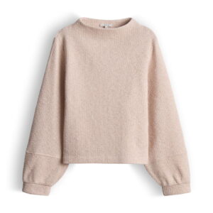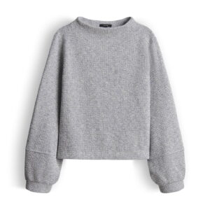 lockere Passform, gerader Schnitt, überschnittene Schulter mit Langarm, Funnel Neck, Rückenlänge ca. 57 cm bei Größe 36, Model Größe 174 cm – trägt Größe 36, Sweatware, Strick Optik, weicher Griff, formstabil, zweifarbiges Muster, auffällige Teilungsnähte, Ballonärmel