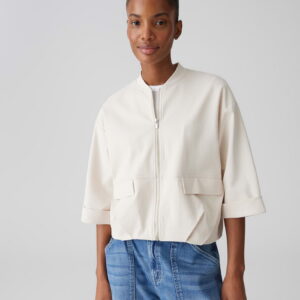 weite Passform, ovaler Schnitt, leicht verkürzter Schnitt, überschnittene Schulter mit Halbarm, Blousonkragen, Rückenlänge ca. 55 cm bei Größe 36, Model Größe 177 cm – trägt Größe 36, Sweatware, glatter Griff, formstabil, Pattentaschen, fixierte Legefalten am Saum, Reißverschluss, Aufschlag am Ärmel