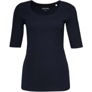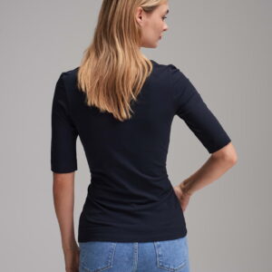 schmale Passform, verlängerter Kurzarm, Rundhalsauschnitt, Rückenlänge ca. 62 cm bei Größe 36, Model Größe 181 cm – trägt Größe 36, BCI Cotton Mix, weicher Griff, elastischer Stoff