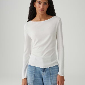 schmale Passform, figurbetonter Schnitt, Langarm, U-Boot-Ausschnitt, Rückenlänge ca. 60 cm bei Größe 36, Model Größe 176 cm – trägt Größe 36, Jersey, dezente Struktur, weicher Griff, elastisch, leichte Transparenz, gewellte Kurbelkante