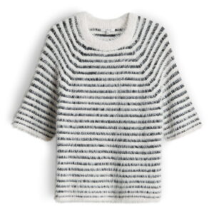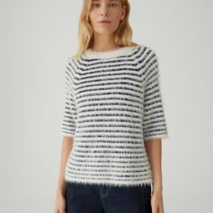 lockere Passform, gerader Schnitt, Halbarm mit Raglan, Rundhalsausschnitt, Rückenlänge ca. 50 cm bei Größe 36, Model Größe 177 cm – trägt Größe 36, Strick, flauschiges Effektgarn, extrem weicher Griff, elastischer Stoff, Streifenmuster