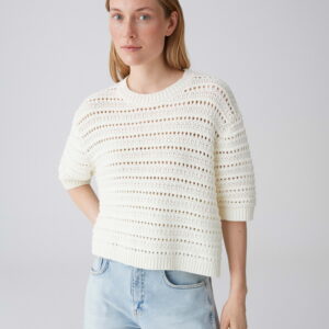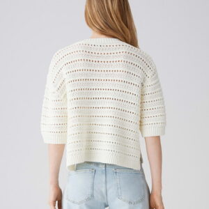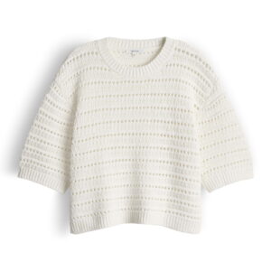 lockere Passform, Boxy Fit, verkürzte Länge, überschnittene Schulter mit Kurzarm, Rundhalsausschnitt, Rückenlänge ca. 48 cm bei Größe S, Farbe milk: Model Größe 174 cm – trägt Größe S, Farbe coffee bean: Model Größe 177 cm – trägt Größe S, Größenempfehlung Gr. S: 36/38 – Gr. M: 40/42 – Gr. L: 44, Strick, Lochstrukur, fester Griff, Strickbündchen, Schlitze in den Seiten