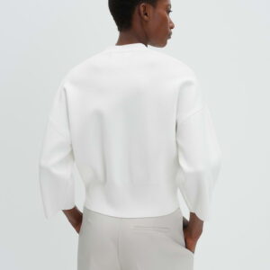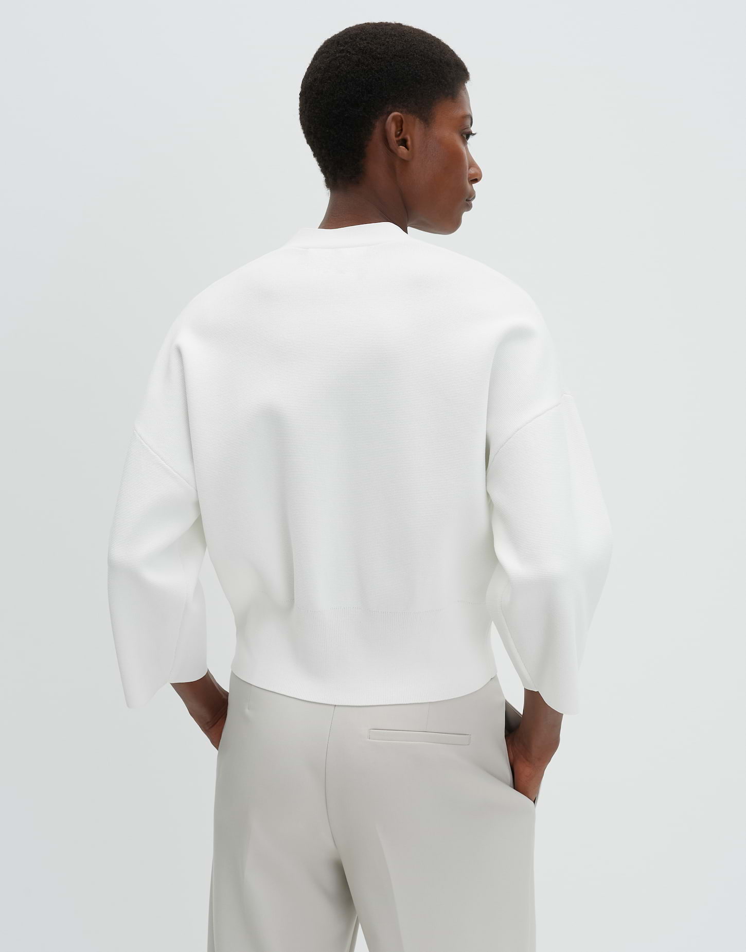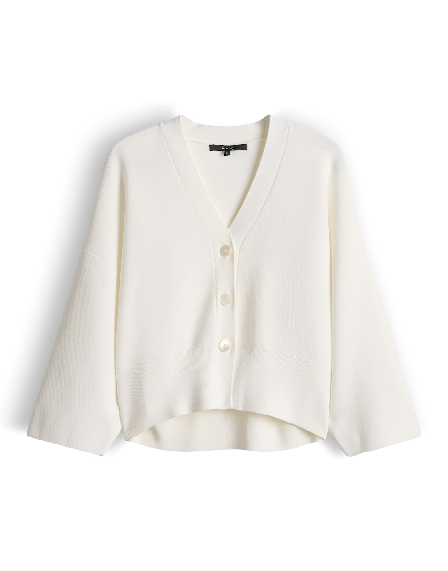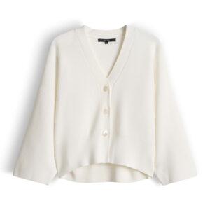 lockere Passform, schmal zulaufend, verkürzte Länge, überschnittene Schulter mit 3/4 Arm, V-Ausschnitt, Rückenlänge ca. 52 cm bei Größe 36, Model Größe 176 cm – trägt Größe 36, Strick, glatter Griff, formstabil, breite Strickbündchen, Knopfleiste