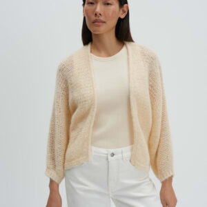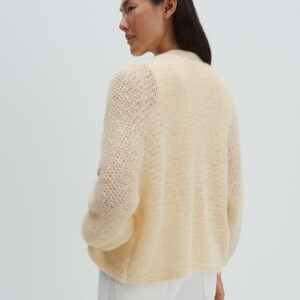 weite Passform, verkürzter Fledermausärmel, Rückenlänge ca. 49 cm bei Größe 36, Model Größe 175 cm – trägt Größe 36, Strick, weicher Griff, leichte Transparenz, Lochstrickmuster, offene Front